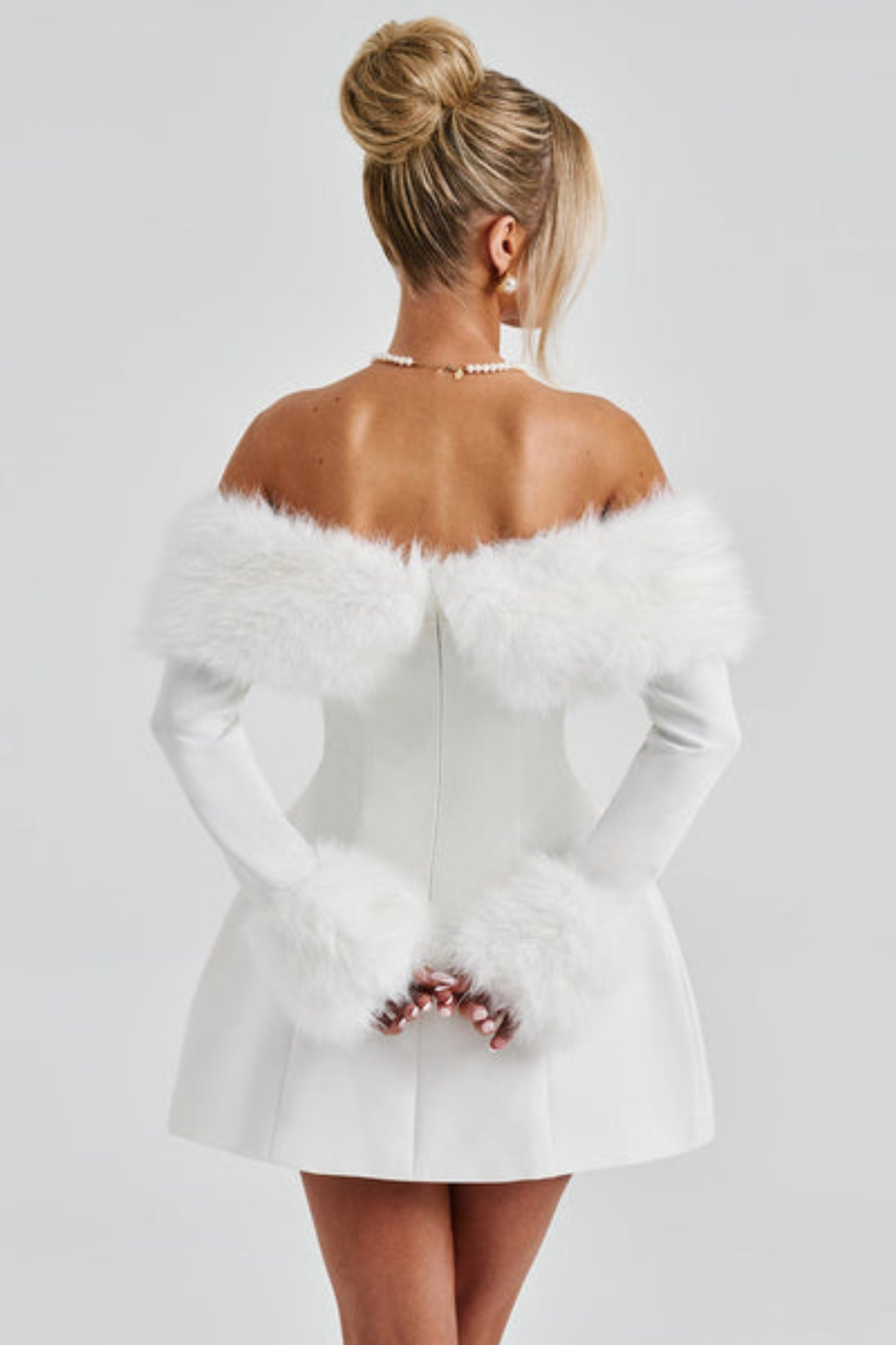 La robe Vahia incarne le parfait équilibre entre sensualité et élégance. Avec son encolure bardot garnie d’une somptueuse bande de fausse fourrure et ses poignets assortis, elle offre une allure hollywoodienne irrésistible — la tenue idéale pour illuminer vos soirées.